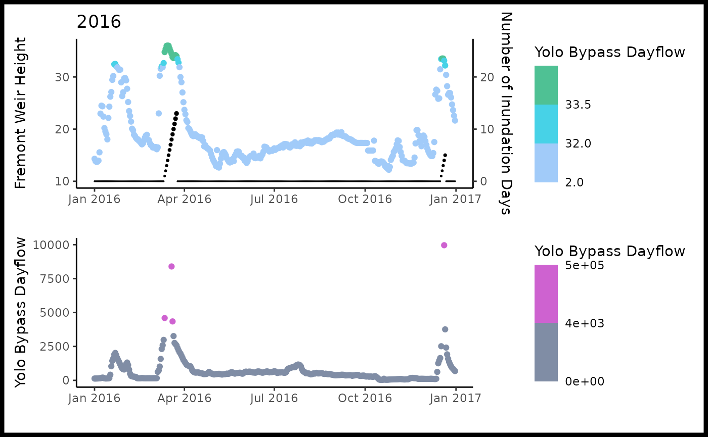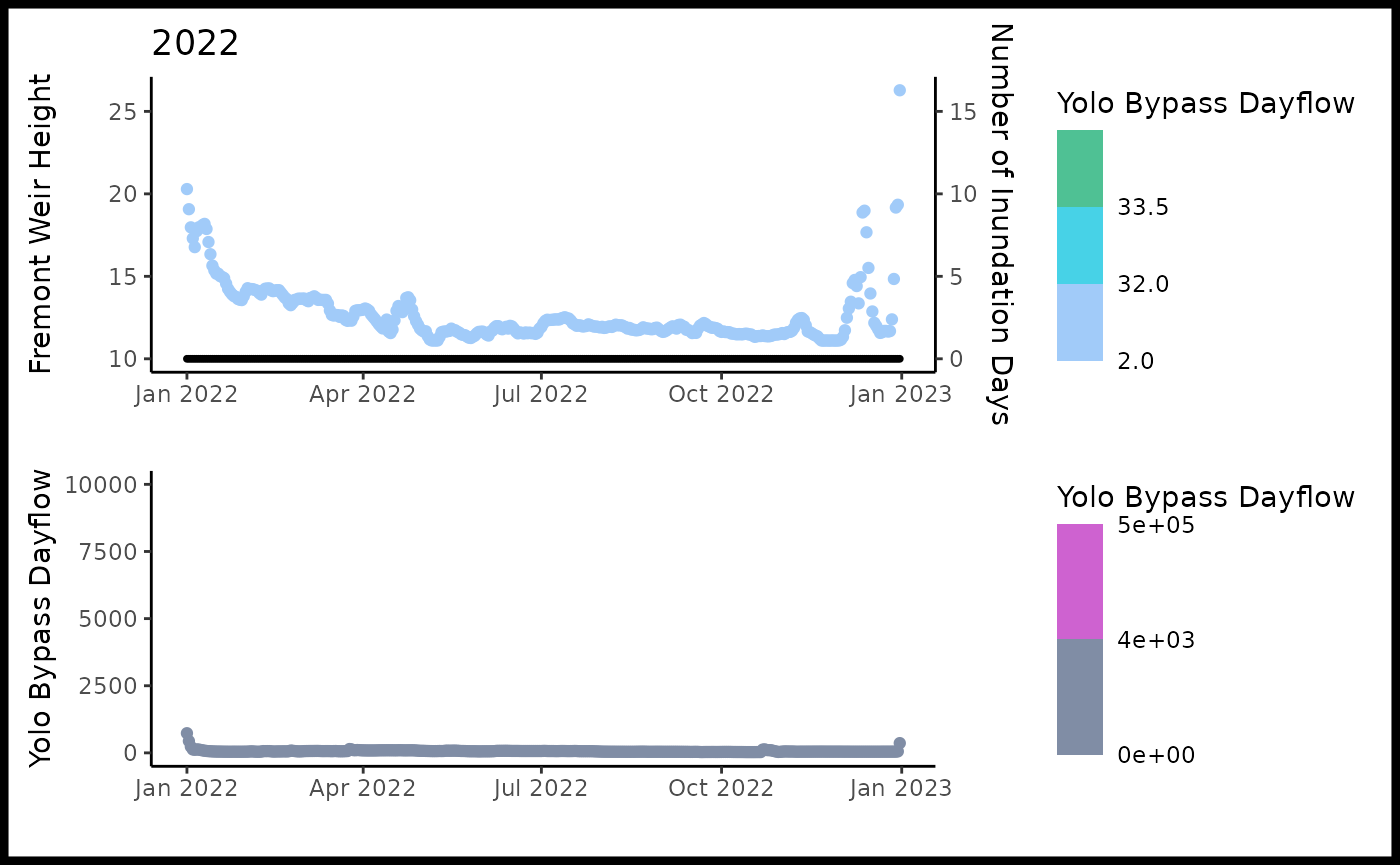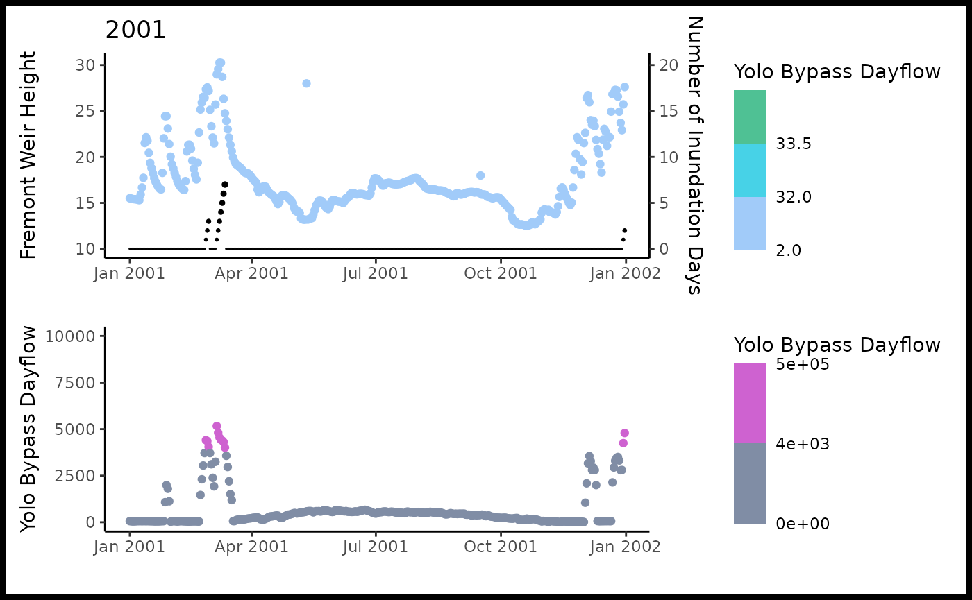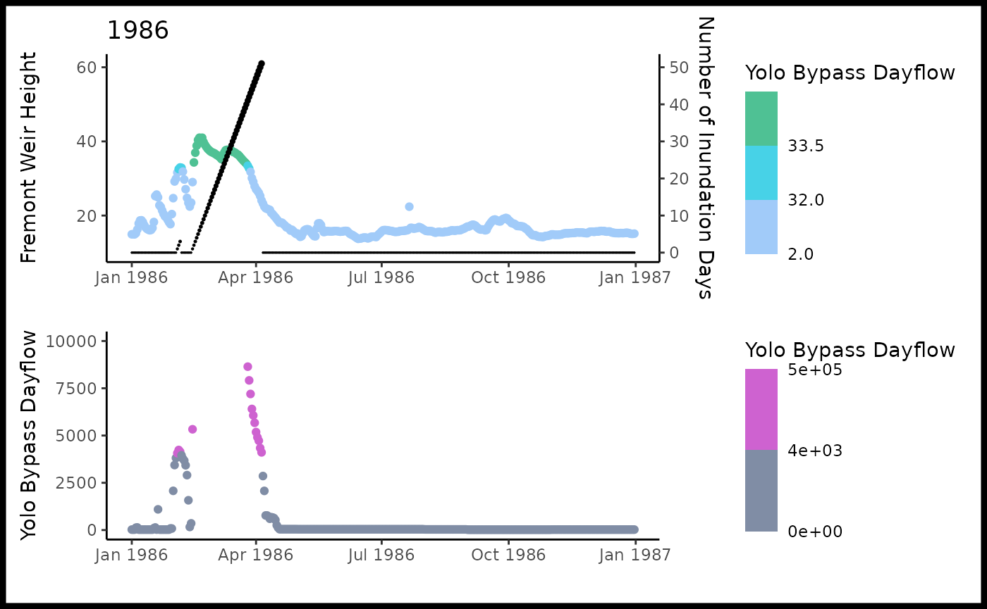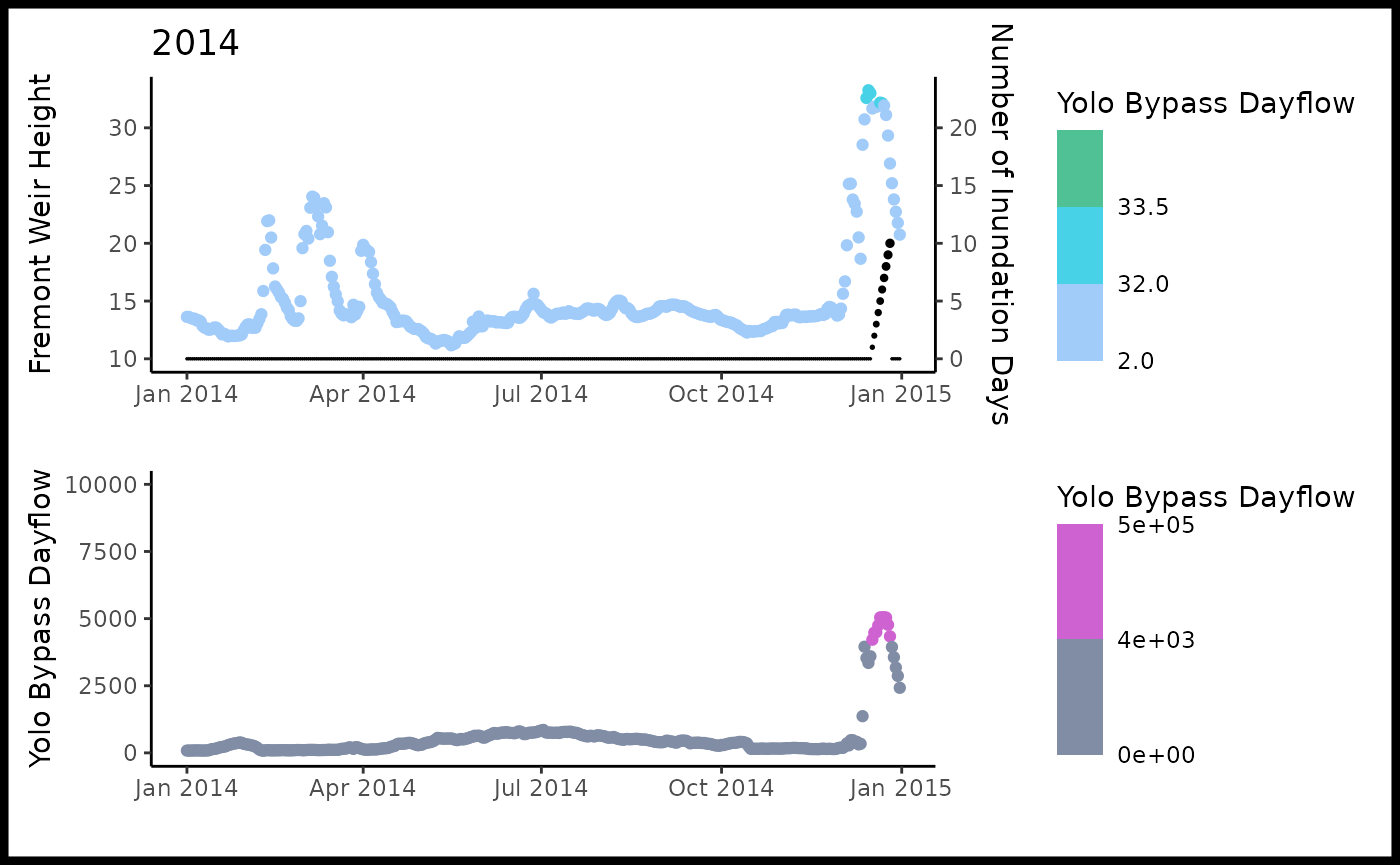 These plots show annual inundation data, including the Fremont weir height, Yolo bypass dayflow, and the number of inundation days.