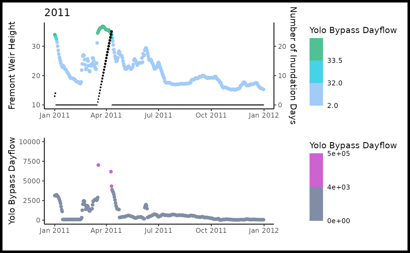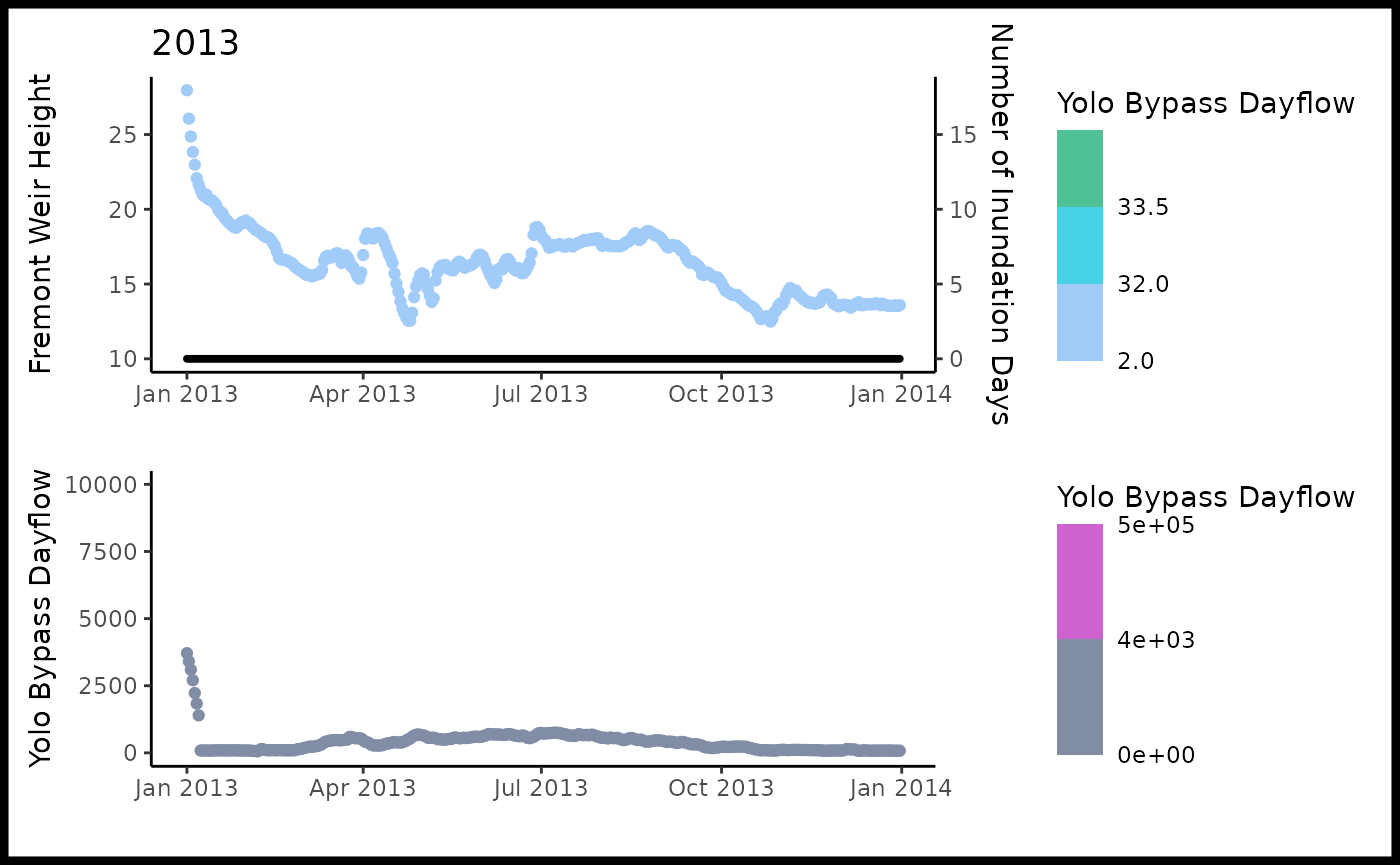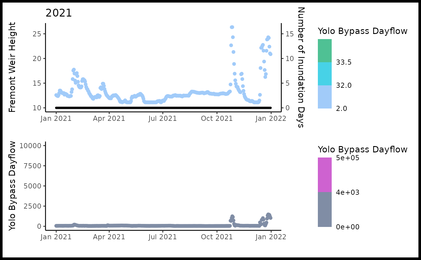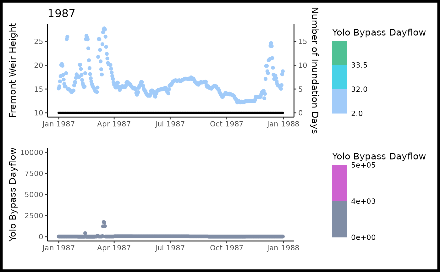 These plots show annual inundation data, including the Fremont weir height, Yolo bypass dayflow, and the number of inundation days.