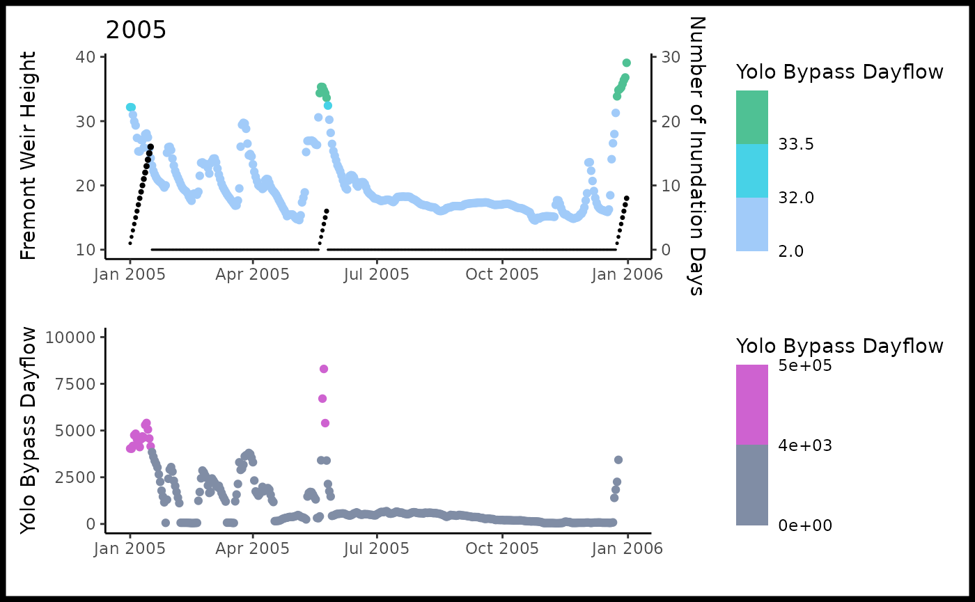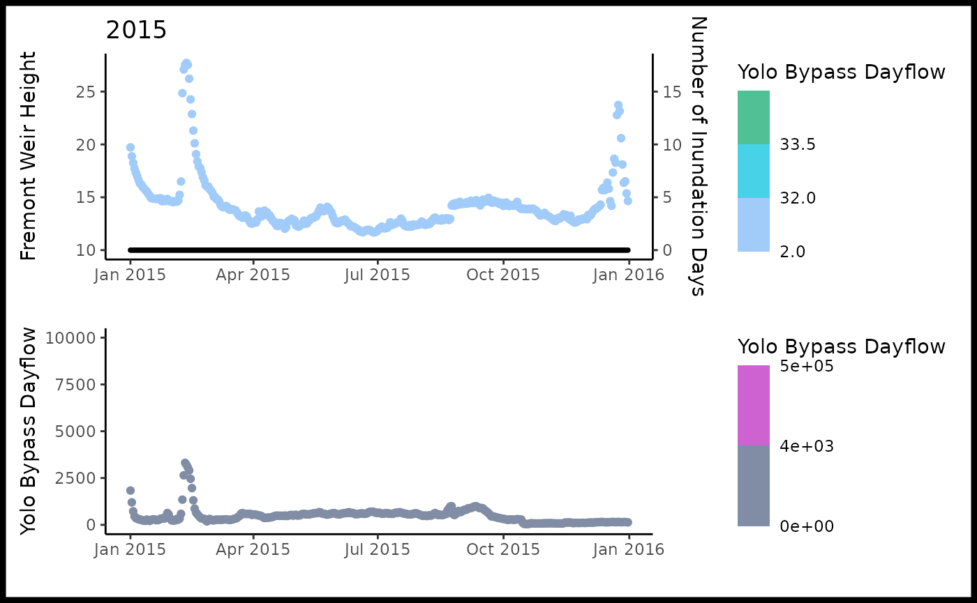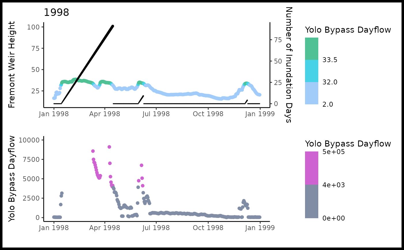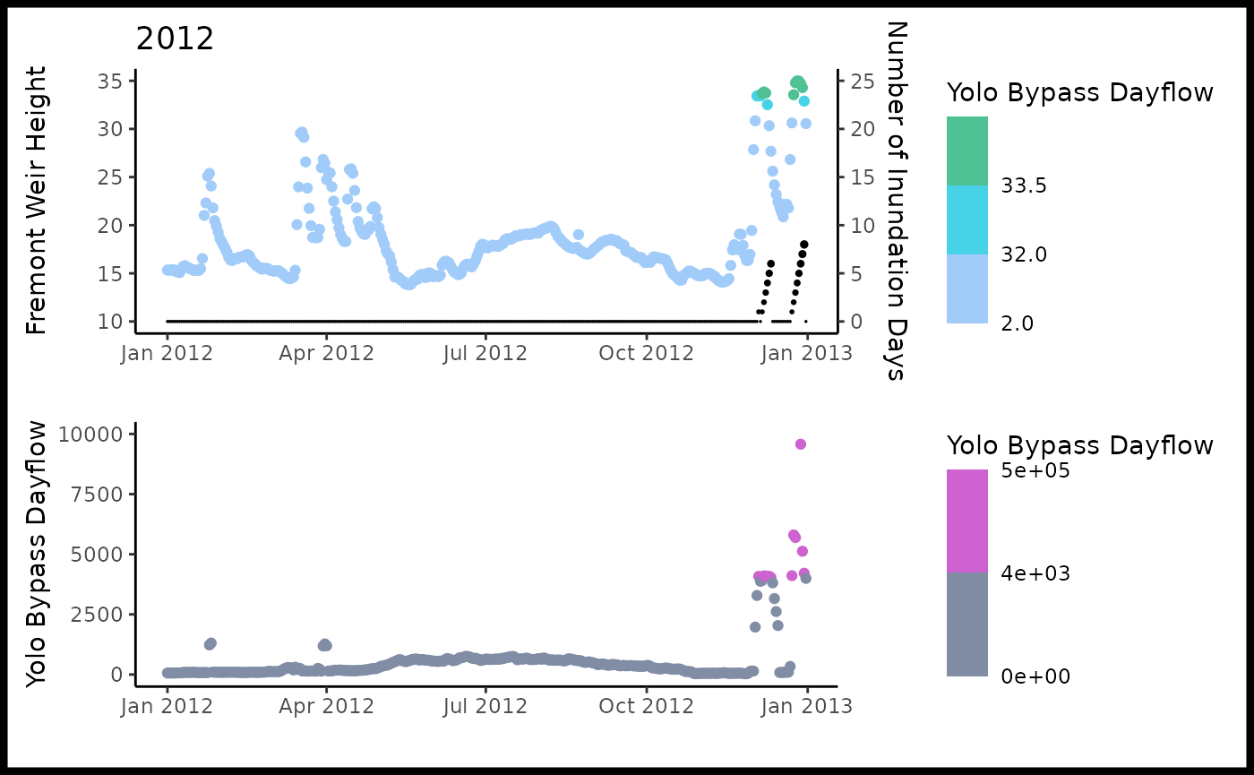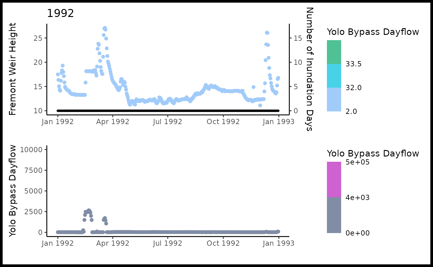 These plots show annual inundation data, including the Fremont weir height, Yolo bypass dayflow, and the number of inundation days.