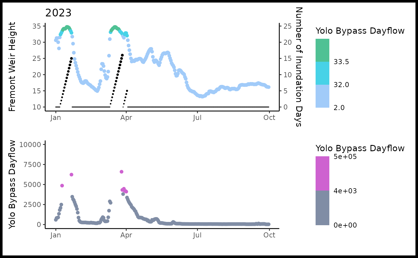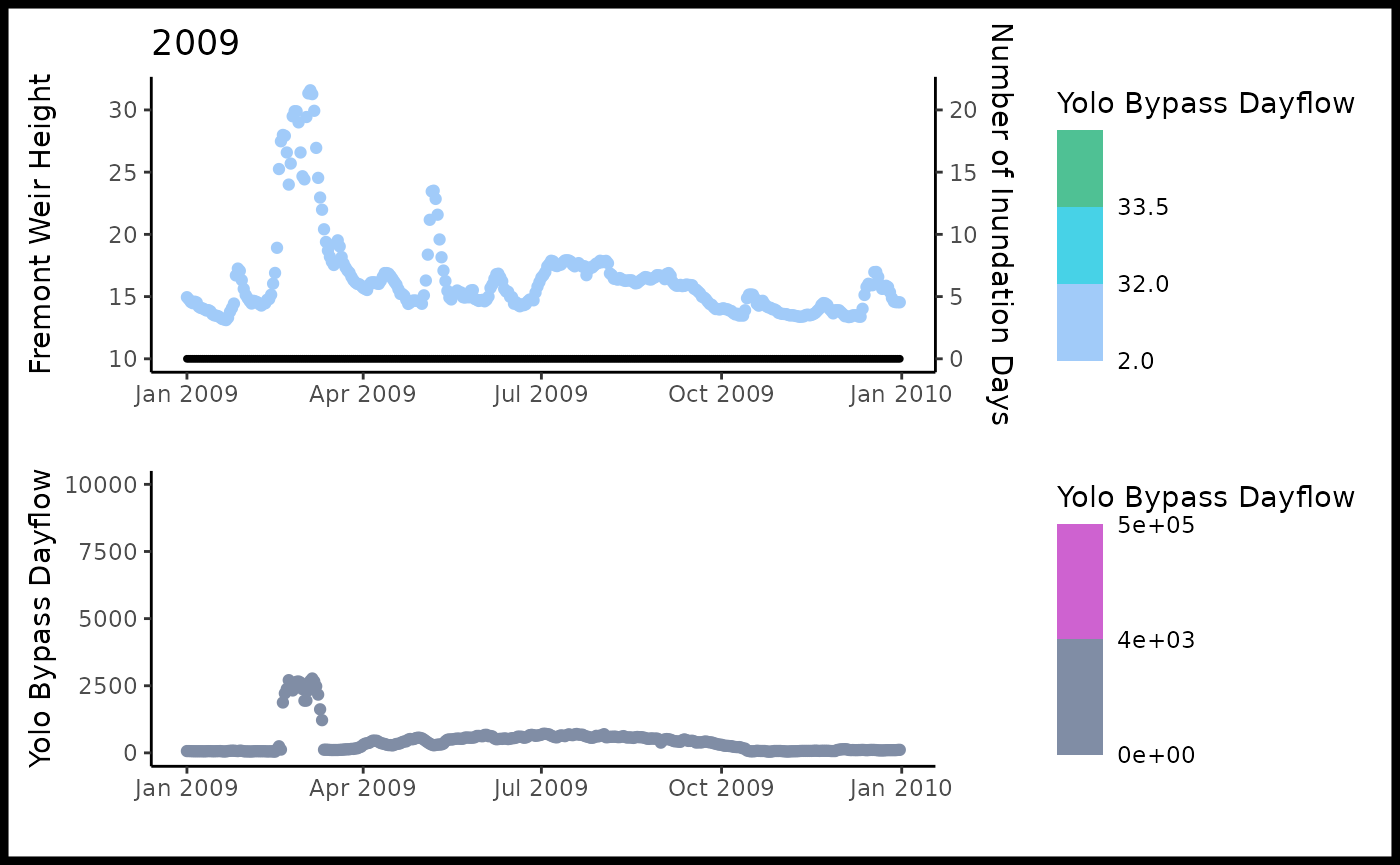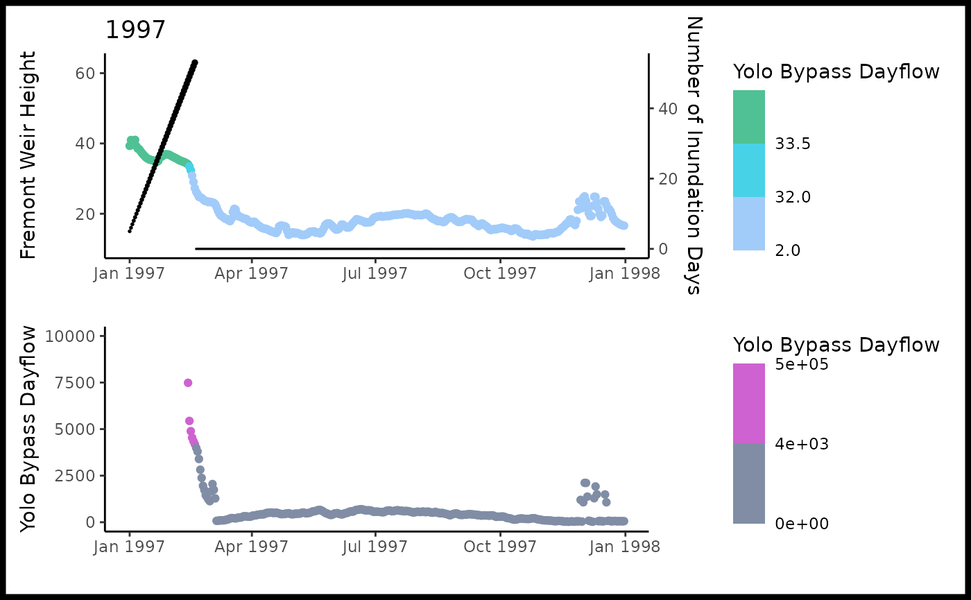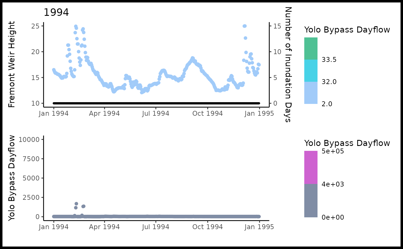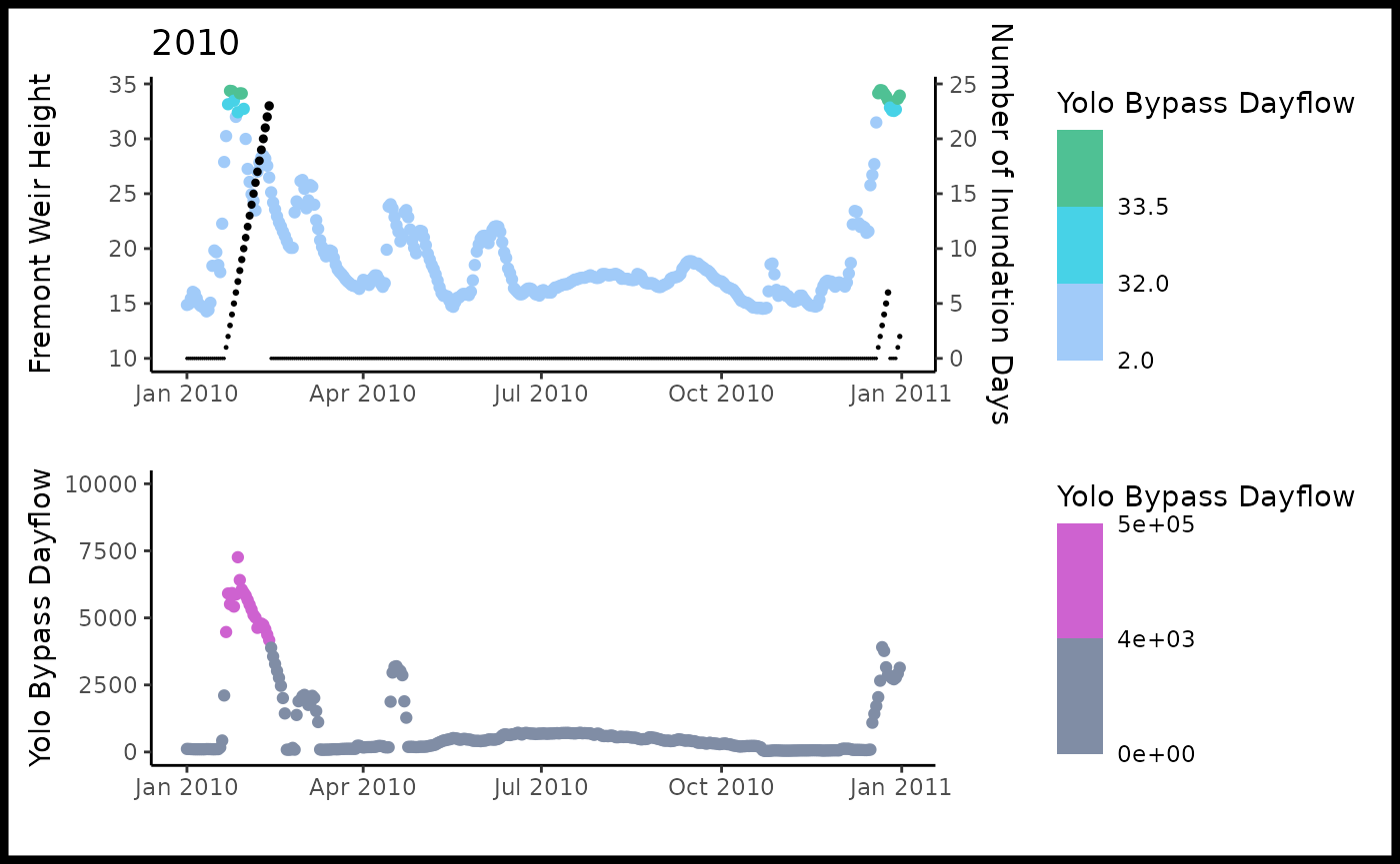 These plots show annual inundation data, including the Fremont weir height, Yolo bypass dayflow, and the number of inundation days.