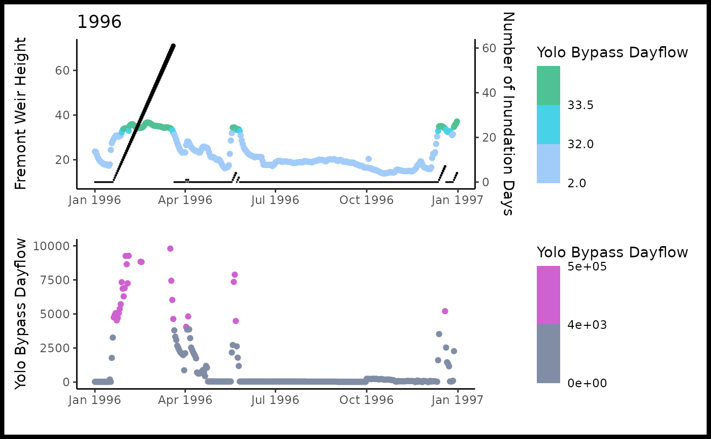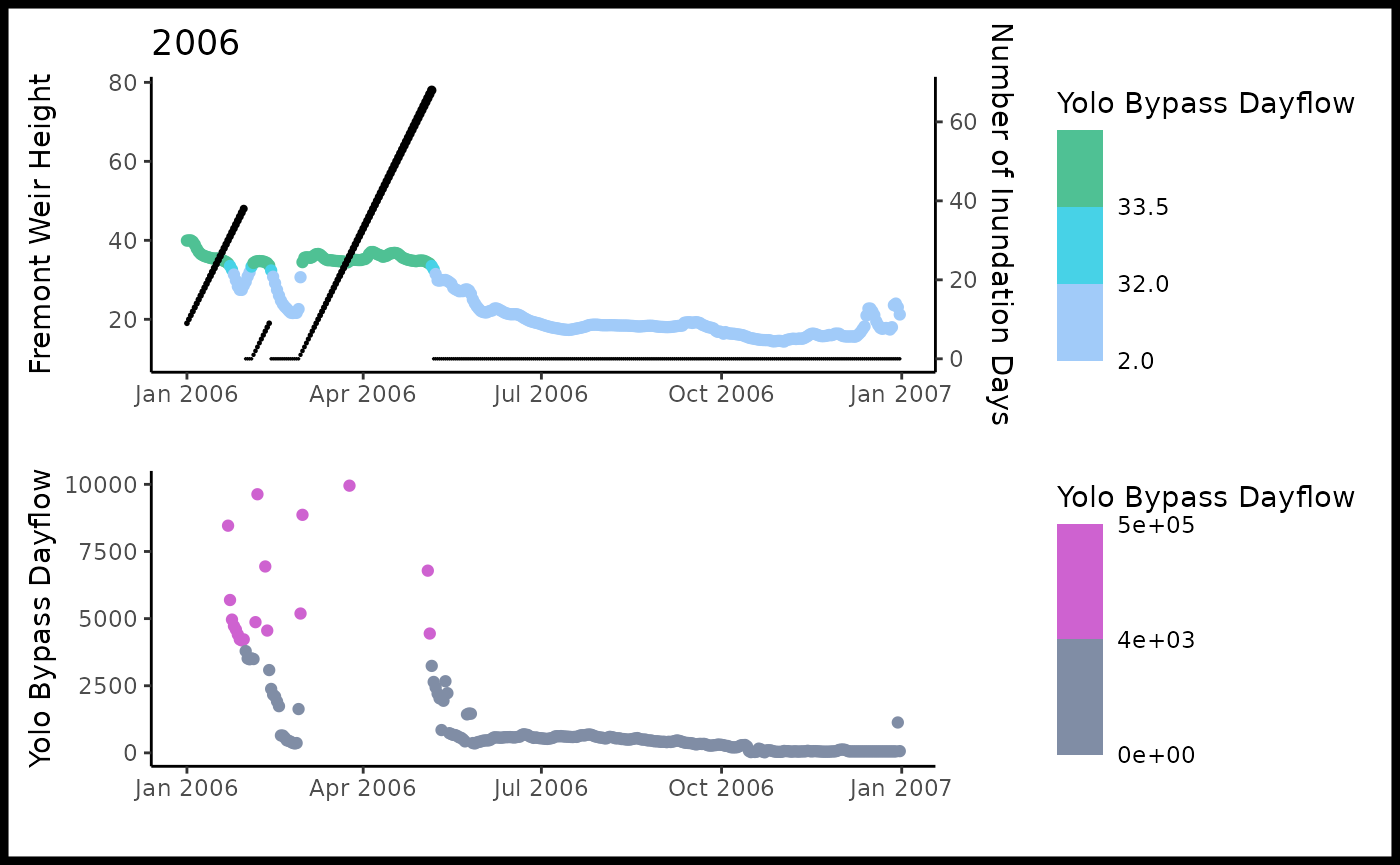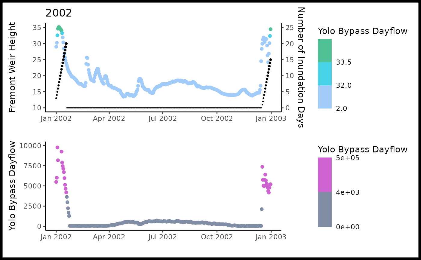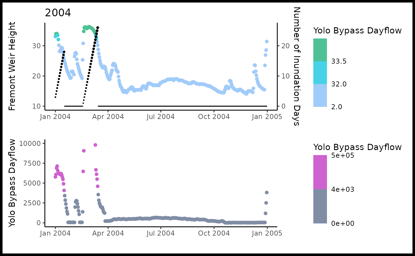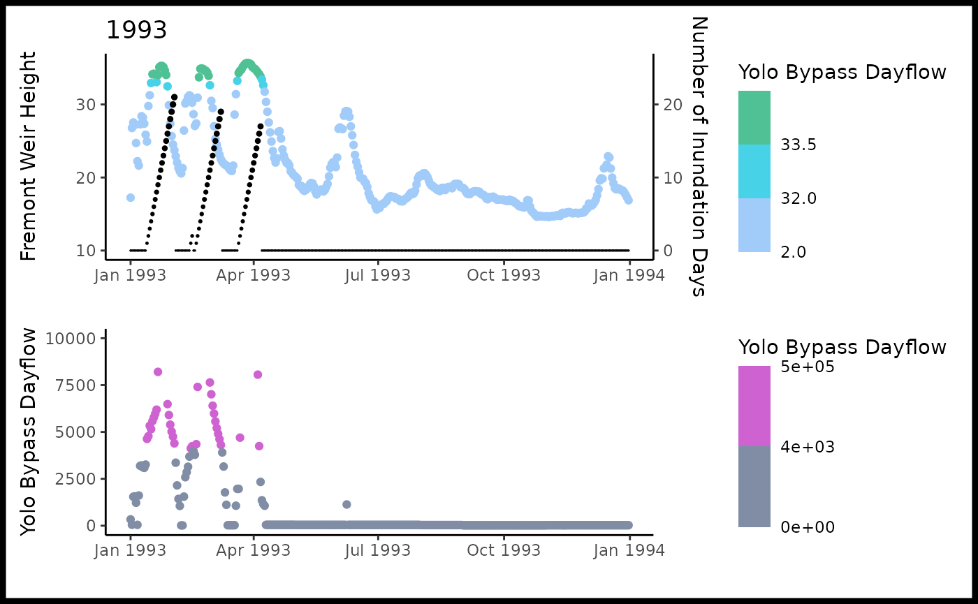 These plots show annual inundation data, including the Fremont weir height, Yolo bypass dayflow, and the number of inundation days.