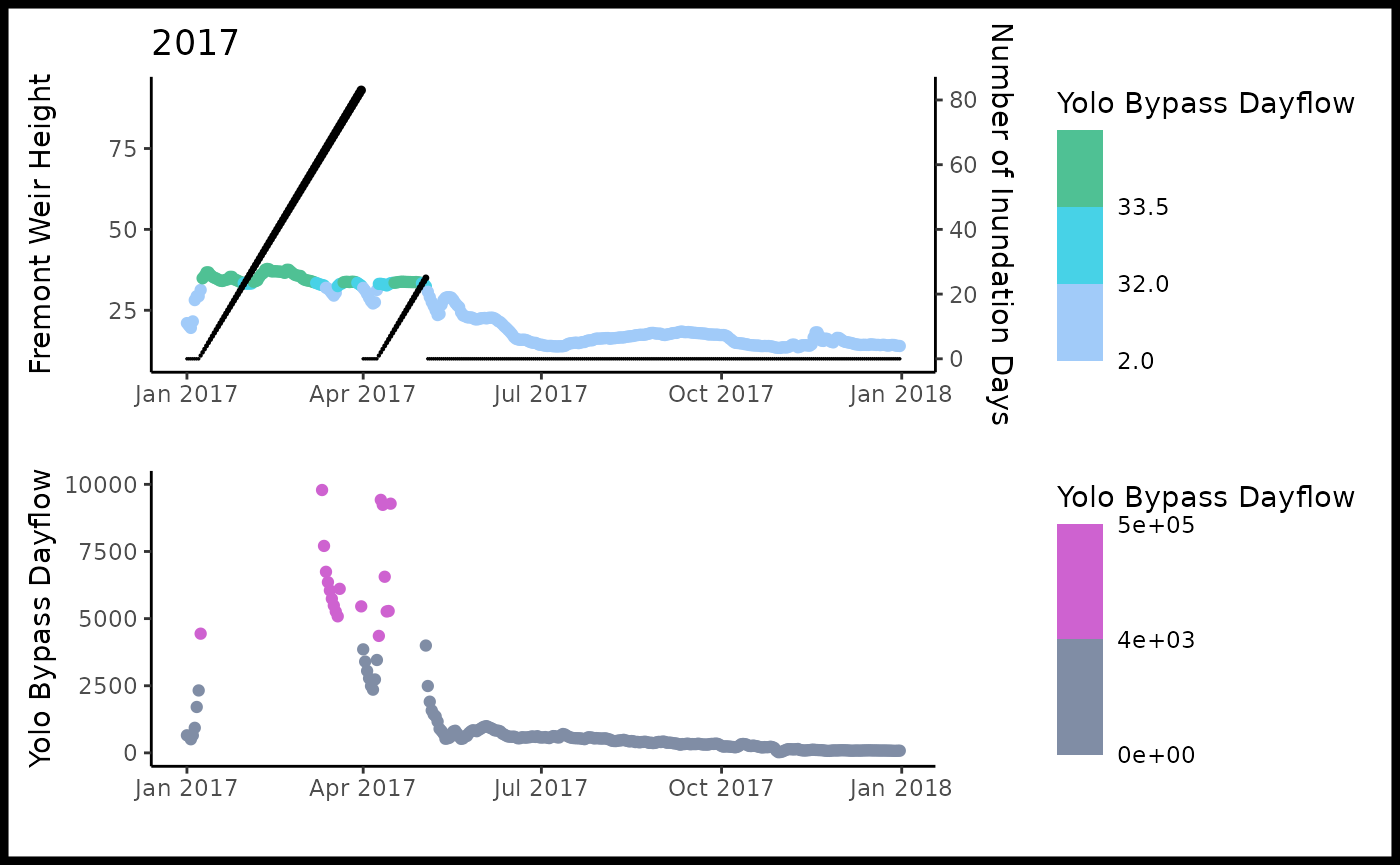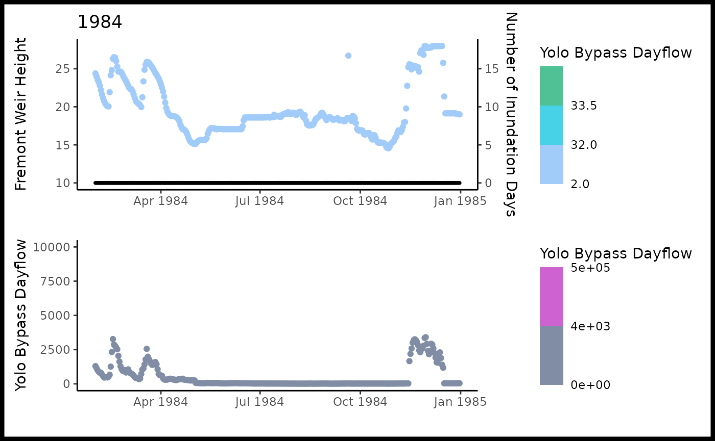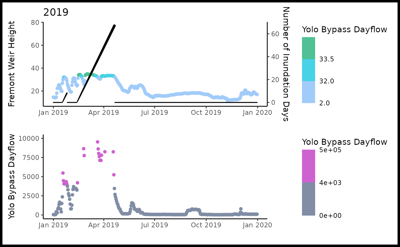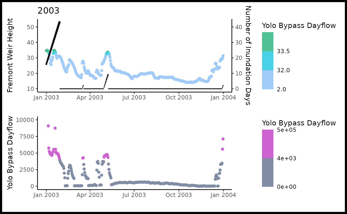 These plots show annual inundation data, including the Fremont weir height, Yolo bypass dayflow, and the number of inundation days.