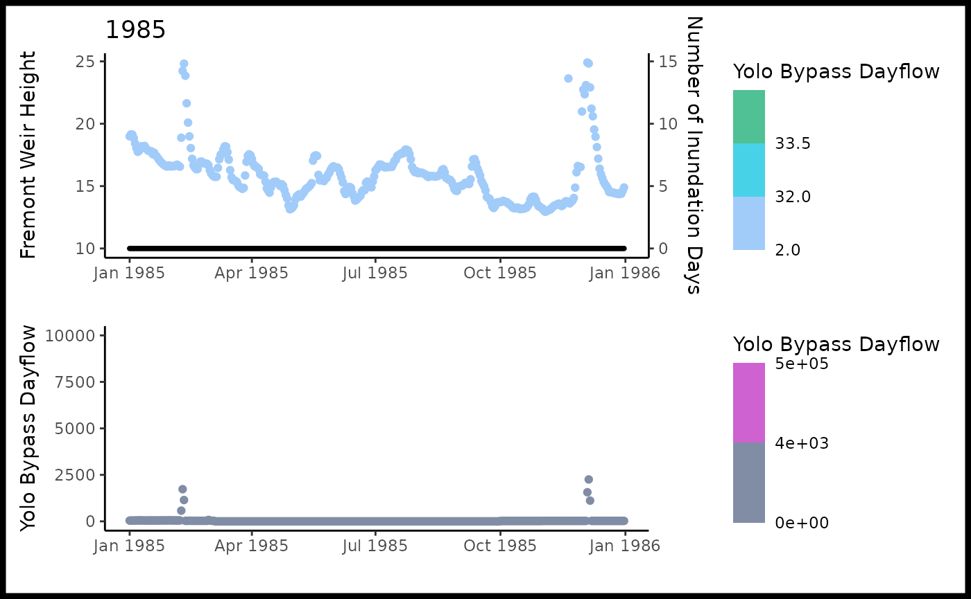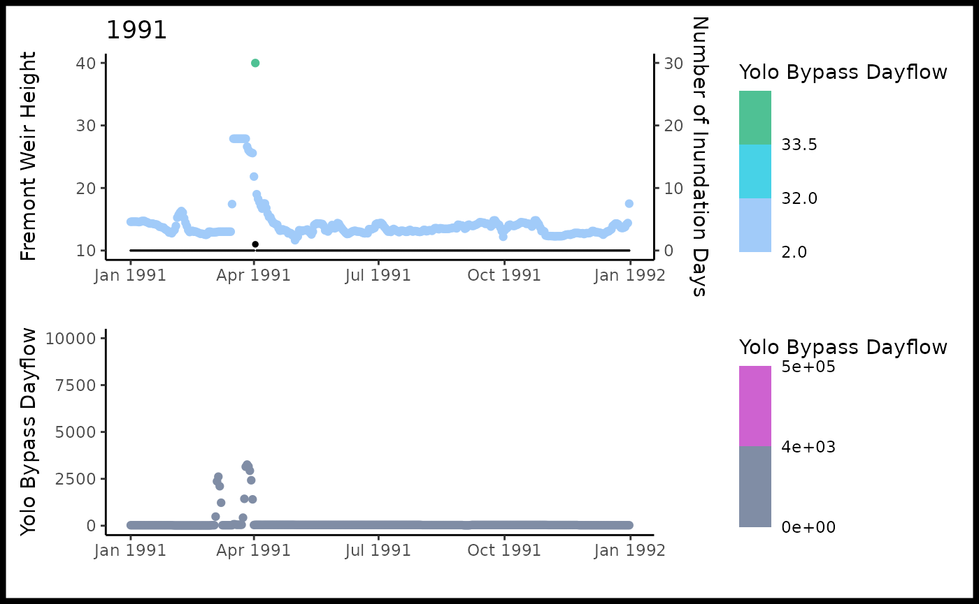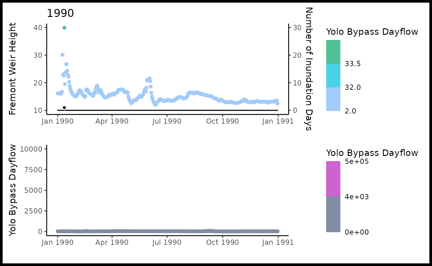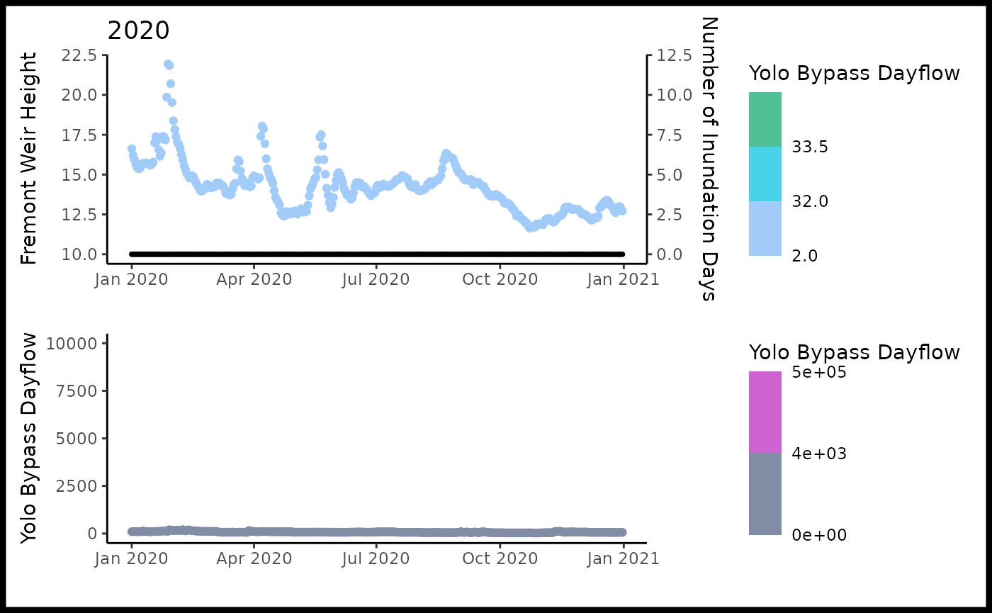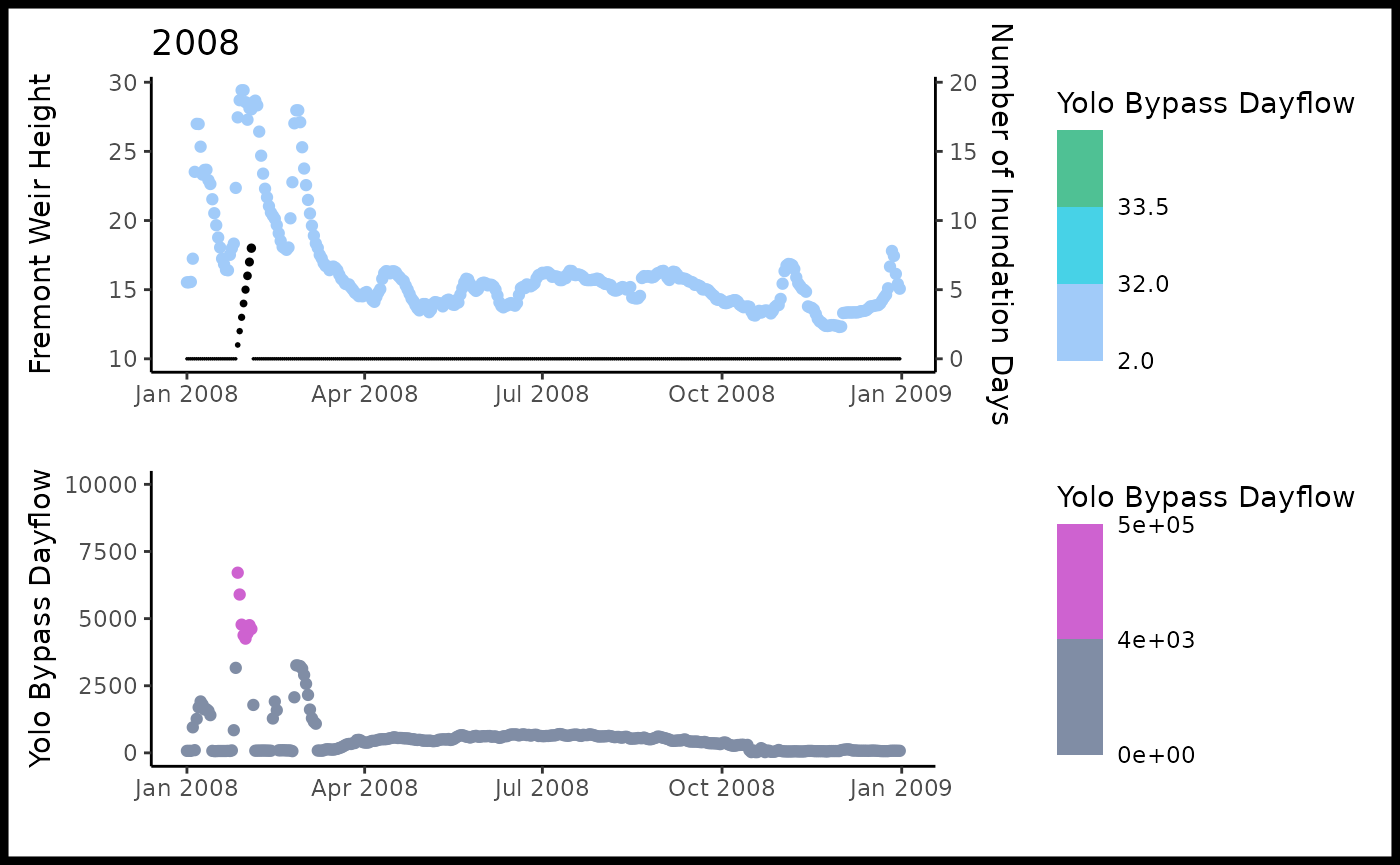 These plots show annual inundation data, including the Fremont weir height, Yolo bypass dayflow, and the number of inundation days.