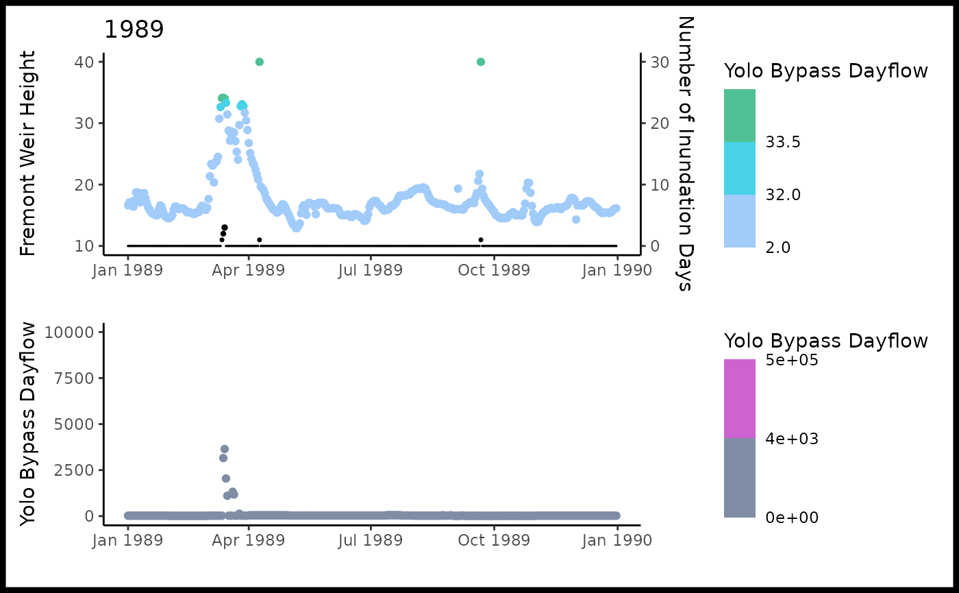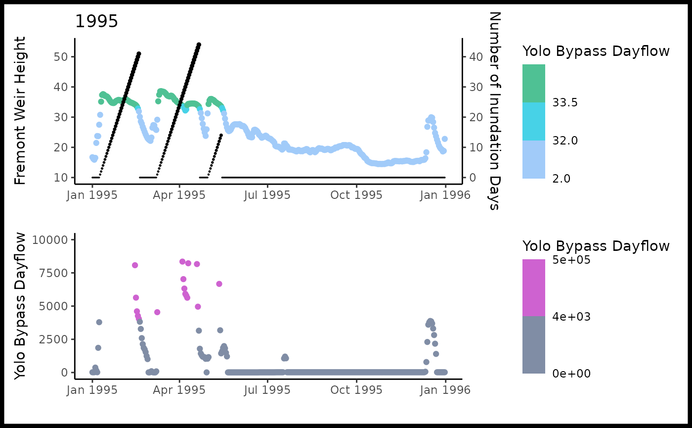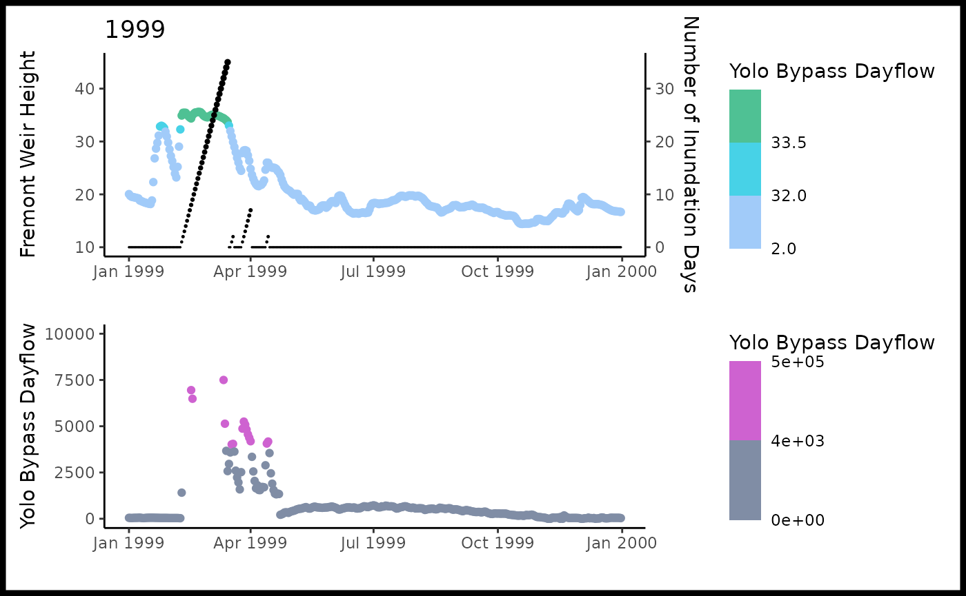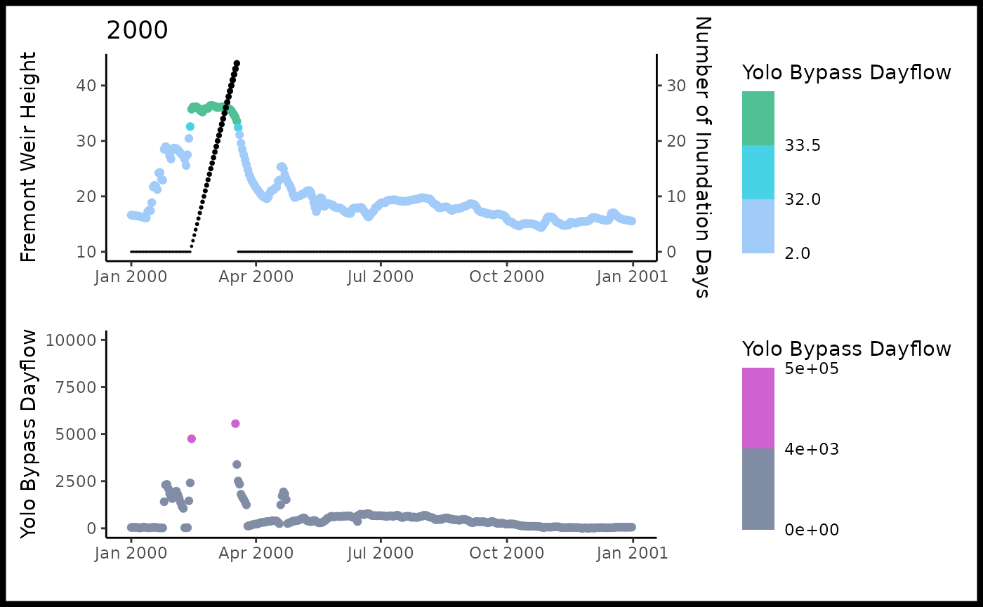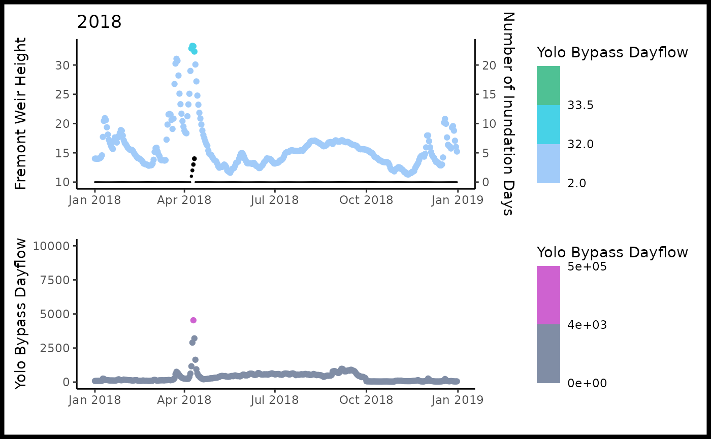 These plots show annual inundation data, including the Fremont weir height, Yolo bypass dayflow, and the number of inundation days.